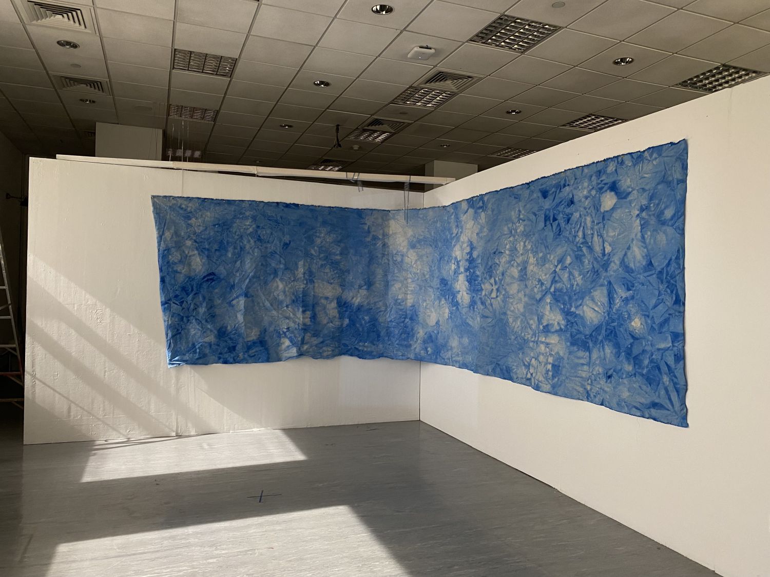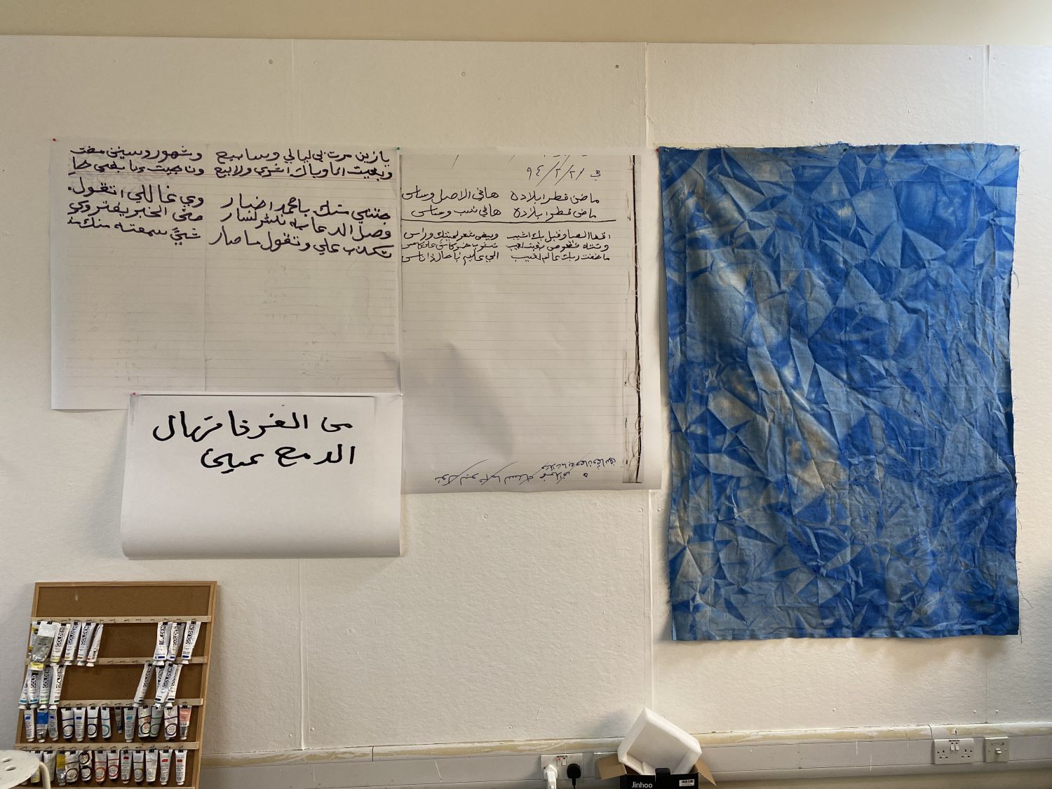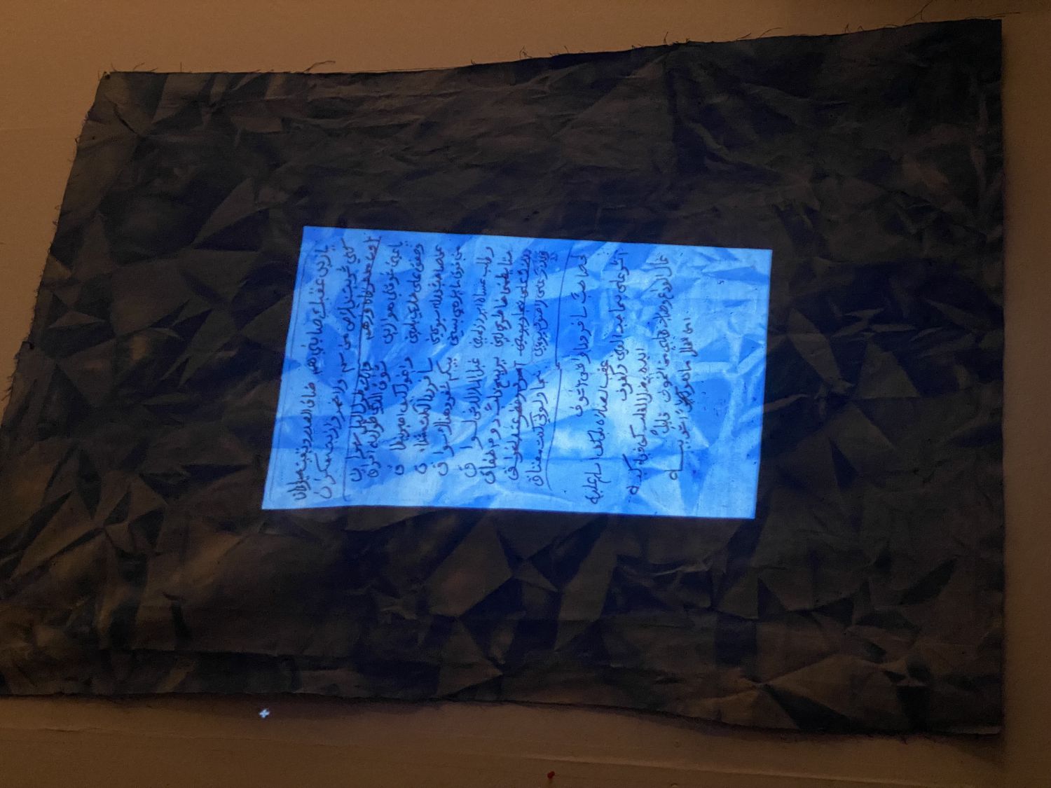 My project is to showcase some of his poems onto the canvas mimicking the sea. To create the effect of the sea on the canvas, I worked with a 6 meters long canvas fabric, which I kept in water and blue ink for 4 days. A video of the ocean with the poetry on top sliding through the canvas just like the waves. The handwritten poems in a display covered with acrylic in front of the canvas for the viewer to see it.