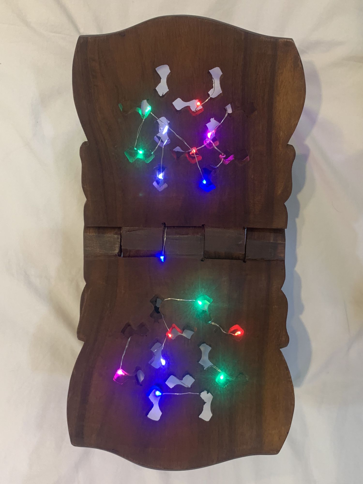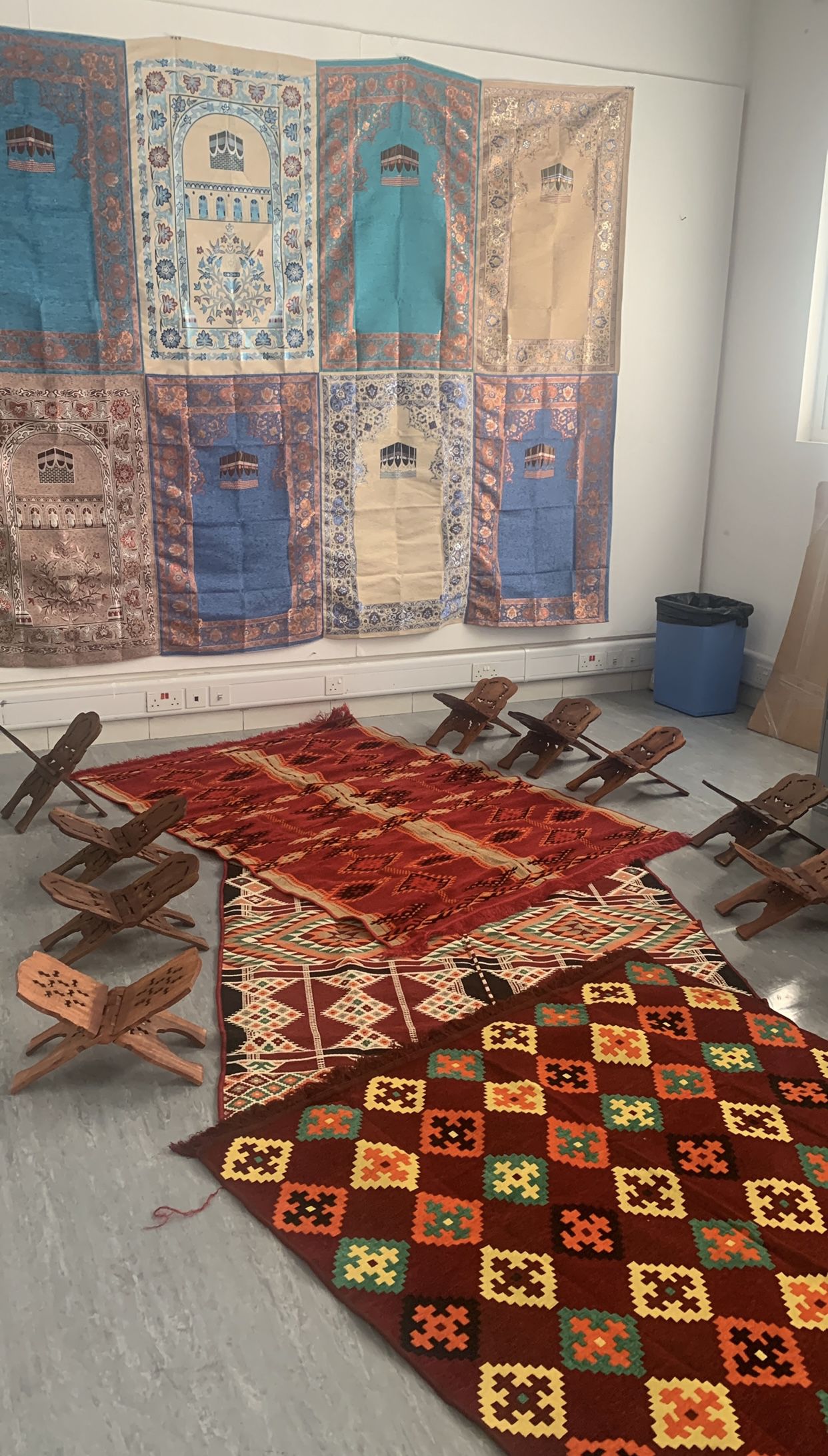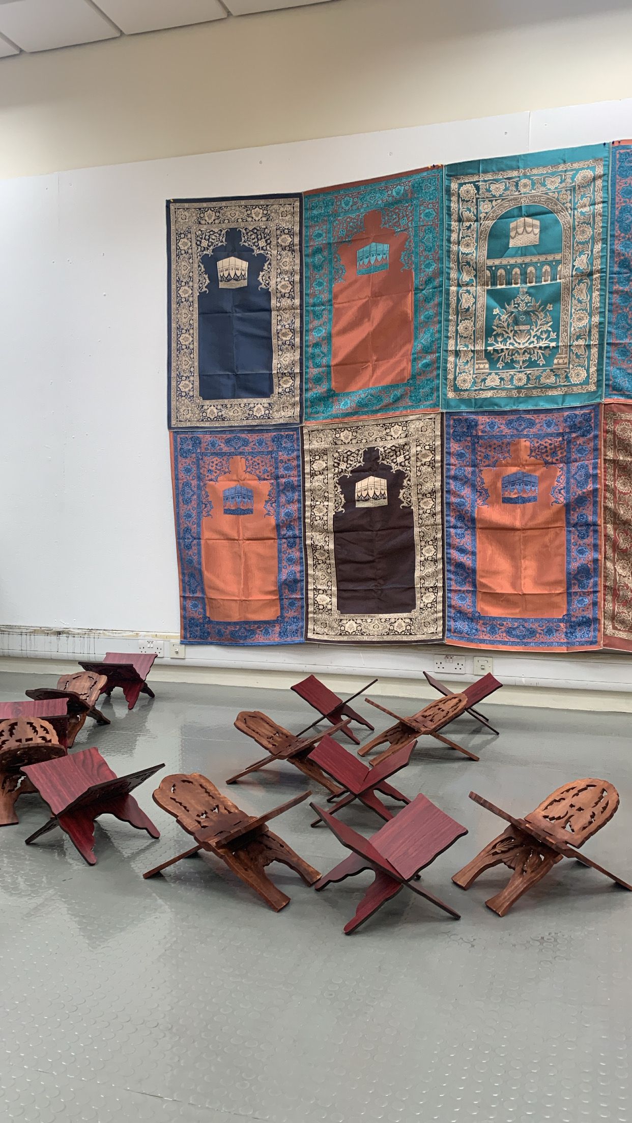 I used different techniques and mixed media to convey my ideas to the viewers. The prayer carpets in my installation symbolizes religion and prayer. I interlaced the carpets as a representation of Muslims' prayer unity. Alongside the carpets, I used 30 Quran holders (where a Quran is usually placed during reading or studying) to symbolize 30 parts of the Quran that the students had to memorize for a ceremony to be held. I also attached lights on to the Quran holders to show that this journey helps enlighten the path to happiness and self-relief. Furthermore, I used sand to represent the classroom environment where children learned the Quran with the help of their instructor (Al-Mutawa). Using the carpets as a “screen” I have also created a video presentation to project on to the carpets, the video contains clips of children memorizing the holy Quran by heart and chanting Al Tahmida (a prayer for God to thank him for helping and fulfilling the journey of reading and memorizing the Quran) This enables the viewers to experience the ceremony.